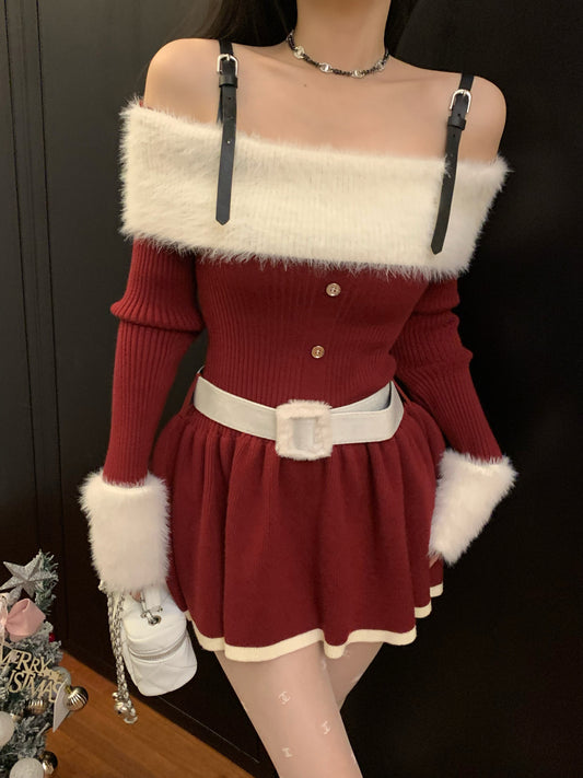 Christmas outfit red one-shoulder long-sleeved knitted New Year's battle robe suspender skirt R0022