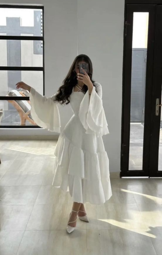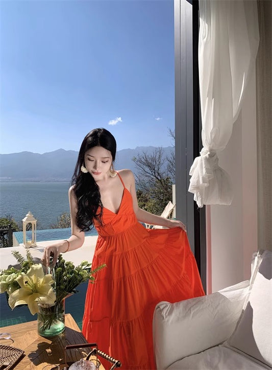 A Line Orange Square Neck Midi Evening Dress, Prom Dress S7005