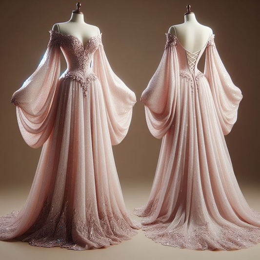 A Line Pink Off Shoulder Tulle Long Evening Dresses Prom Gown S6976