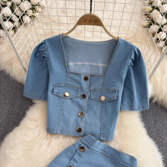 Fashion suit for women hot girl square neck puff short-sleeved denim shirt two-piece set S4100