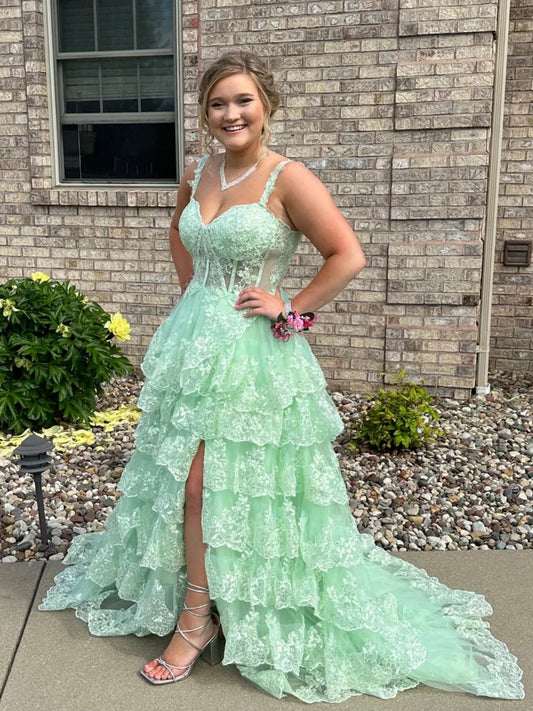 A Line Sweetheart Neck Layered Mint Green Lace Long Prom Dresses with High Slit, Mint Green Lace Formal Graduation Evening Dresses S7200
