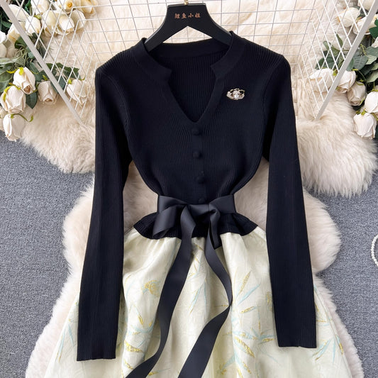 French style luxury dress for women knitted splicing jacquard fluffy dress S4510