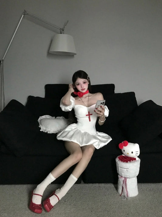 French style white off-shoulder dress 2025 bow pleated tie waist skirt R1215