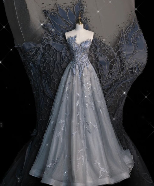 A Line Tulle Prom Dress Strapless Long Prom Dresses Birthday Gown S6549
