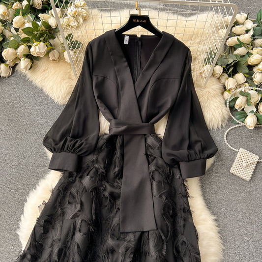 High-class lady temperament pleated lantern long sleeve loose A-line solid color elegant dress R0319
