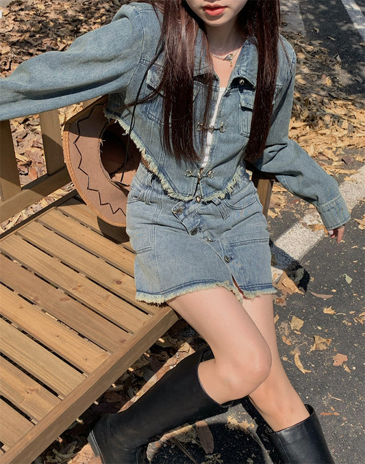 High-end design long-sleeved jacket retro hot girl short skirt American street slim denim suit R0144