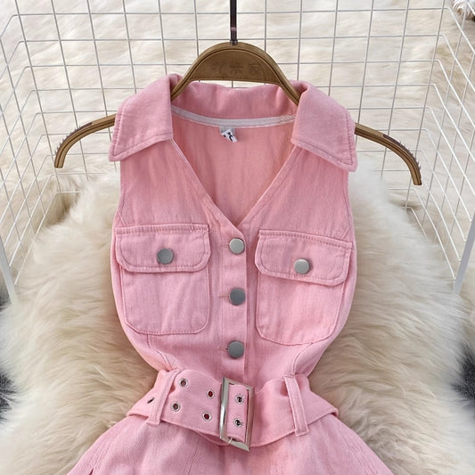 hot girl sexy denim skirt design halter neck A-line puffy pleated dress S4283