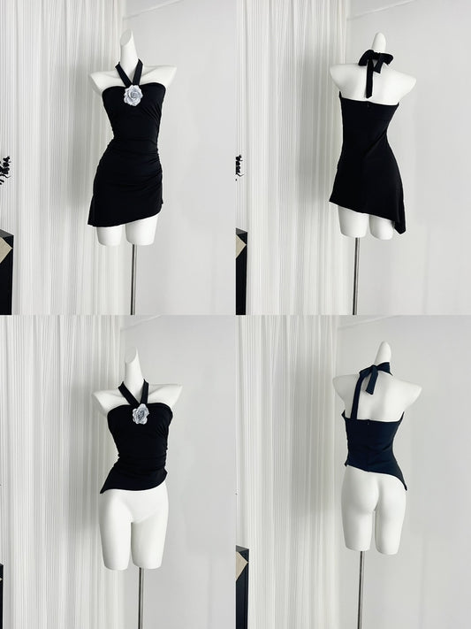Hot girl halter neck dress female summer 2025 new black tube top irregular flower skirt R0122