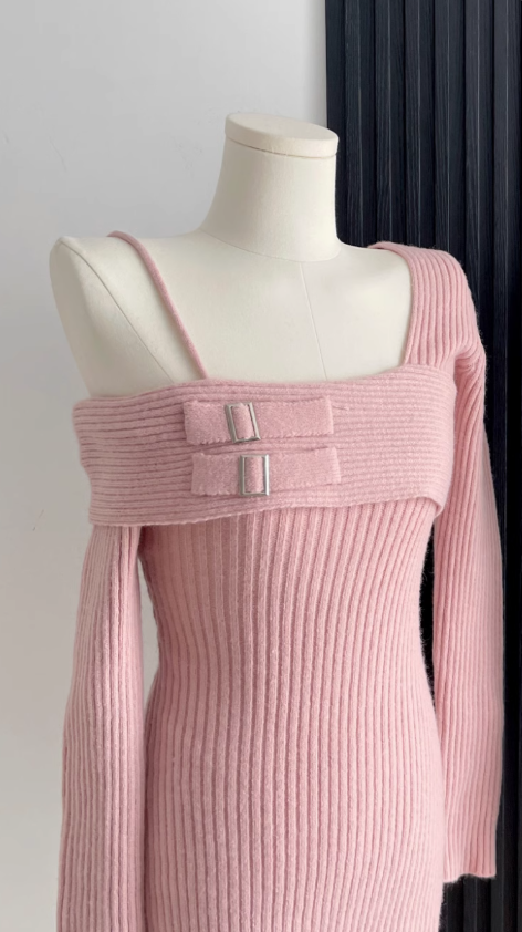 Hot girl off-shoulder knitted dress 2025 new design pure desire inner sweater dress slimming R0148