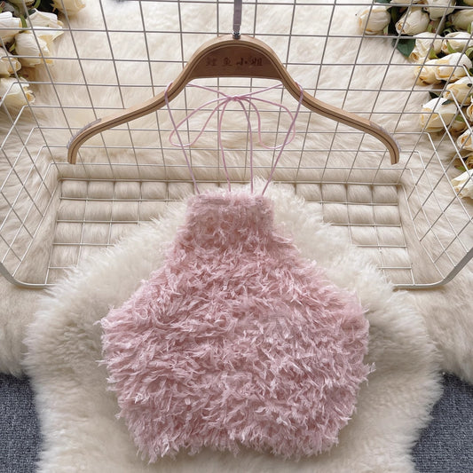 Hot girl sleeveless fur halter neck vest female 2025 high waist hip skirt pants suit R1067