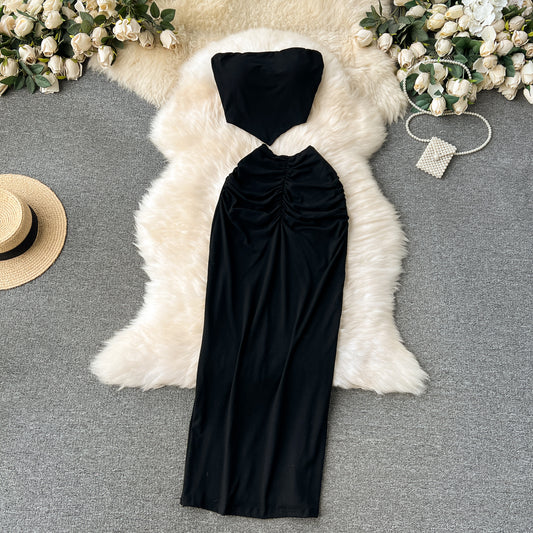 Hot girl slim fit pleated strappy dress 2025 lazy style halter neck hip long skirt R1133