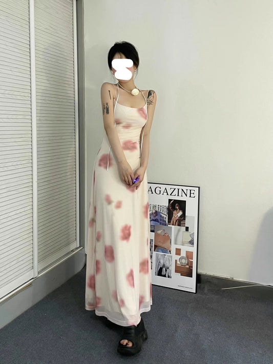 Human peach print elastic mesh suspender dress for women summer slim and tall sexy high-end long skirt R0089
