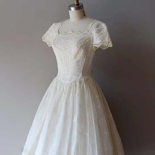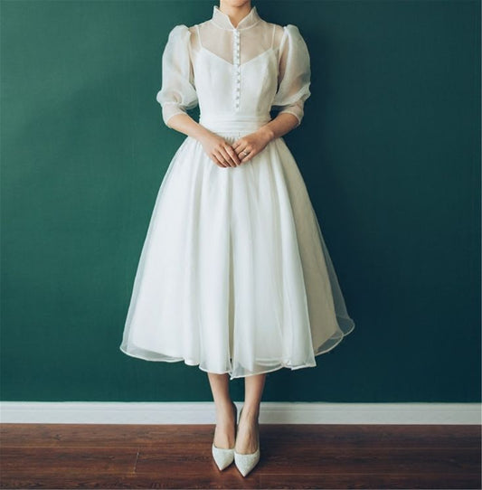 Ivory Organza Short Tea Length Wedding Dress,Vintage High Neck Wedding Dress,Short Bridal Dress Gown S3544