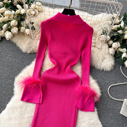 knitted dress for women lapel feather tight design skirt S4539