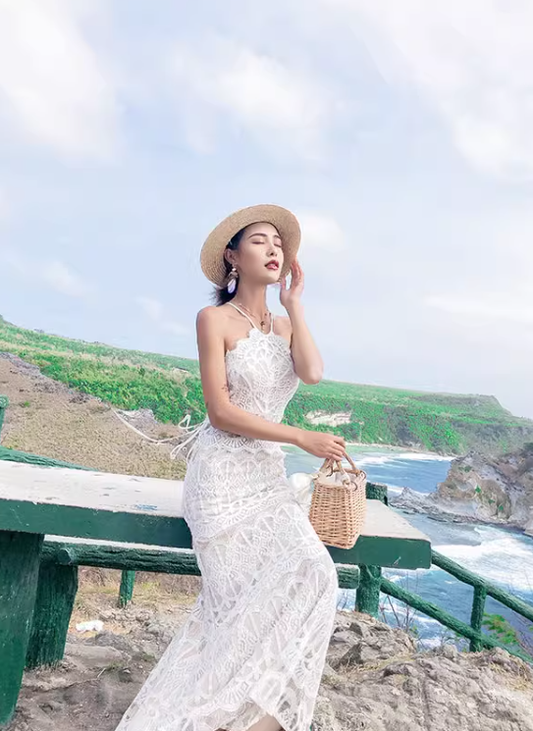 Lace Embroidery Halter Neck Dress Holiday Slim Fit Long Dress Backless Fishtail Beach Dress Women R0185