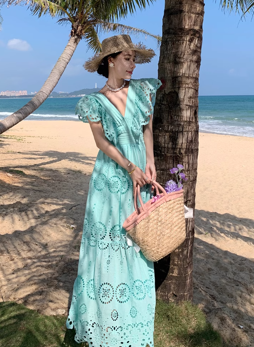 Lace hollow embroidery hook flower ruffle V-neck Thai dress fairy holiday ruffle long skirt R0187