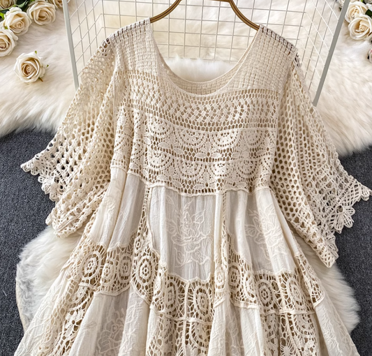 2025 new hollow hook flower knitted dress mid-length sleeve dress elegant and fashionable loose R0337