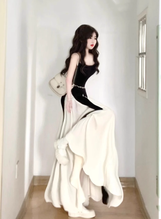 2025 new French black and white contrast suspender dress seaside holiday temperament waist A-line long skirt R0423