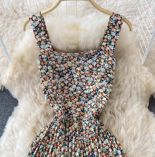 2025 new French floral dress sweet fairy suspender long skirt holiday knee-length pleated dress R0376