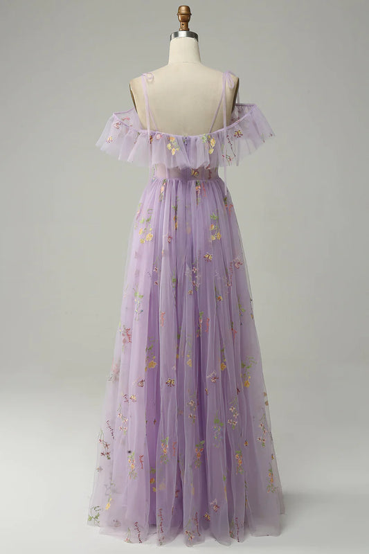 Lilac Off-the-Shoulder Embroidery Ruffled Long Prom Dress with Slit S2613