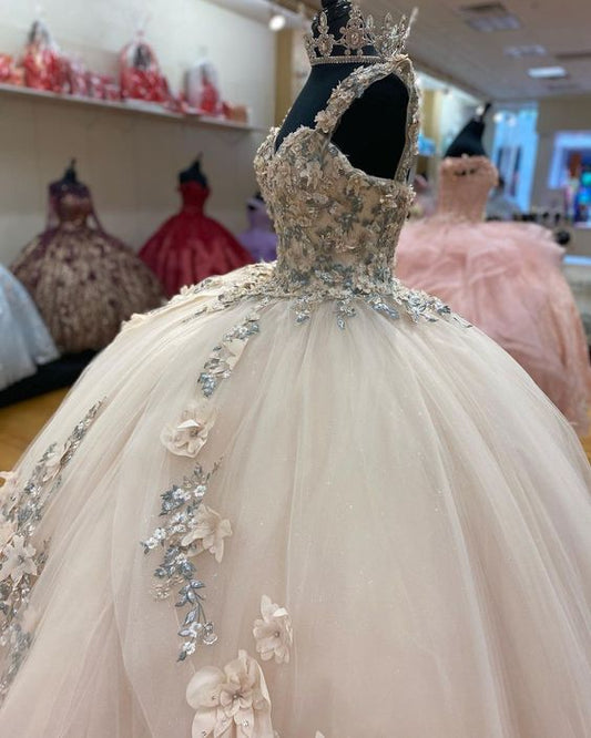A-line Tulle Ball Gown Puffy Sweet 16 Dress 3D Flowers Birthday Dress S2332