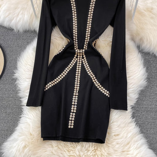 long-sleeved diamond-studded V-neck A-line dress elegant long skirt S4089