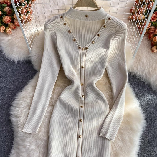 Long-sleeved halterneck V-neck stretch knit dress S4303