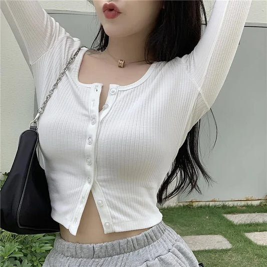 New Autumn Thin Ribbed Cardigan Women Sexy Long Sleeve O Neck Button Up Crop Top Korean Clothing S2795