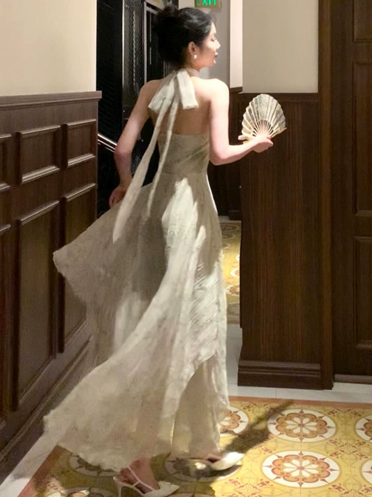 New style lapel heavy hook flower hollow French lace dress sexy long skirt R2306