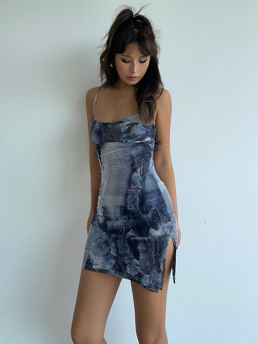 Newspaper mesh suspender short skirt hot girl hip-hugging figure dress European and American style R3041