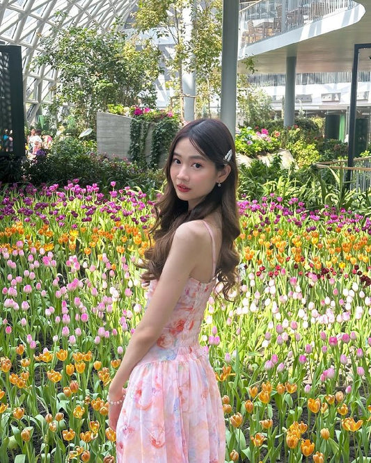 Pink floral suspender dress, beautiful waist, slim fit, hip fishtail skirt R0631