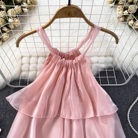 pink ruffled halterneck dress round neck a-line short skirt S4418
