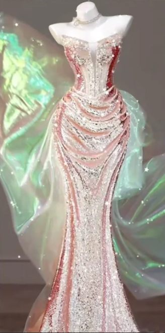 Pink strapless fishtail top, bodycon pleated skirt, long ball gown R6426