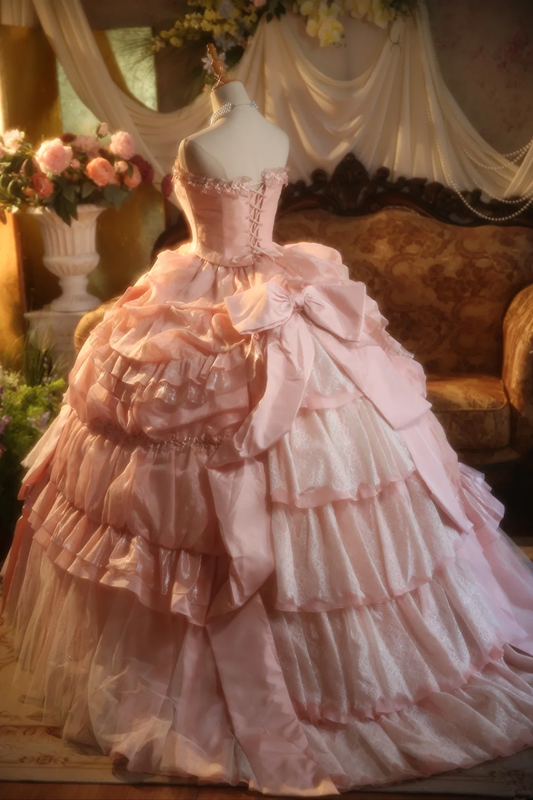Pink strapless ball gown with a cinched waist and a voluminous tiered cake skirt; bridal gown R7282