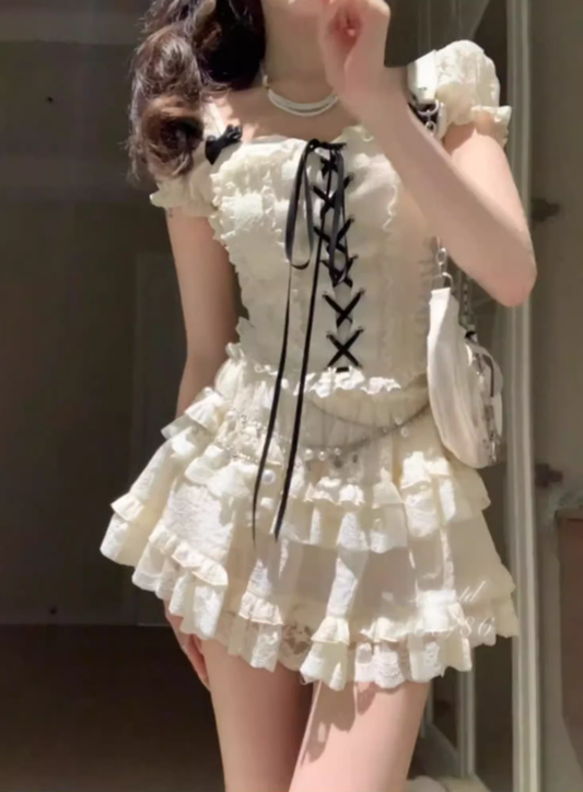 Pure desire style puff sleeves tie waist top 2025 lace splicing a-line skirt suit R1247