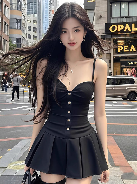 Pure desire style sexy black suspender dress new style waist slimming A-line short skirt R3393