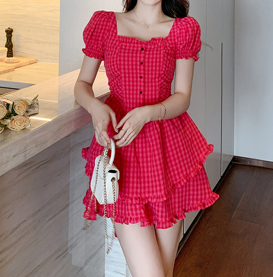 Rose red square neck bubble short sleeve plaid dress new French waist sweet princess tutu skirt R0064