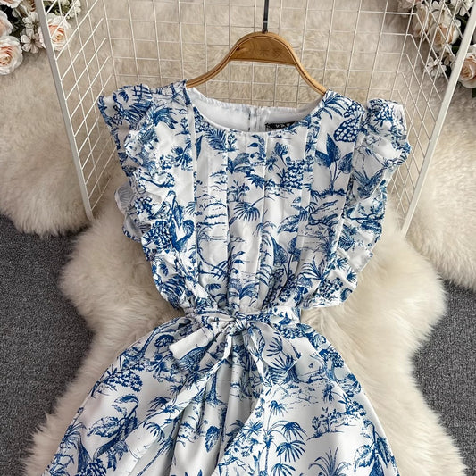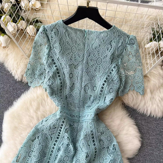 round neck ruffle sleeve lace dress women's new elegant long skirt S4554