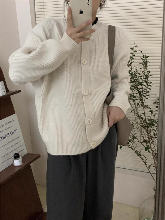 round neck solid color knitted cardigan for women autumn retro soft waxy loose warm sweater jacket S3378