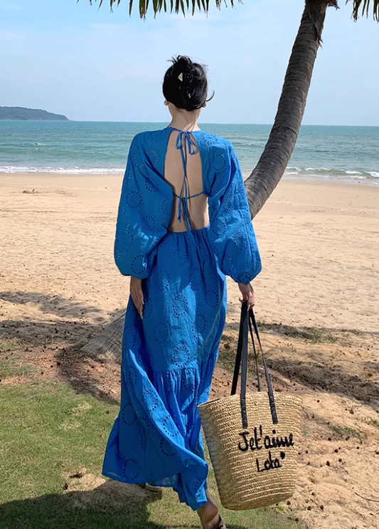 Seaside travel long skirt hollow waist slim embroidery backless long sleeves big swing dress R0186
