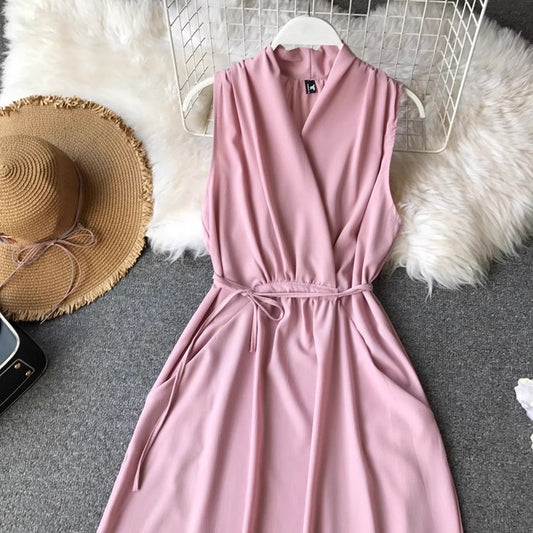 Sleeveless dress for women chiffon mid-length V-neck solid color simple S4350
