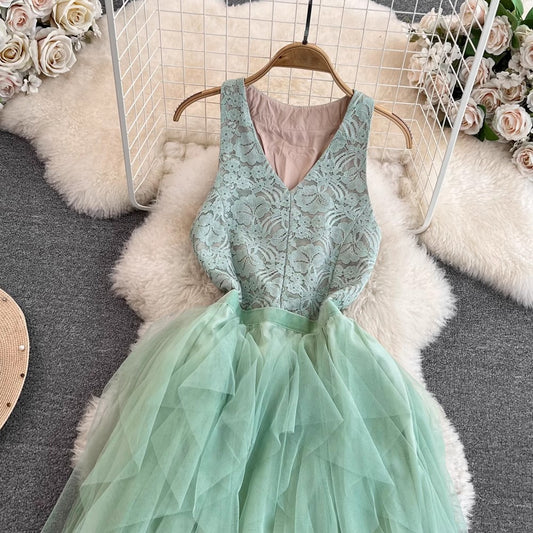 sleeveless V-neck lace A-line mesh dress elegant long dress S4332