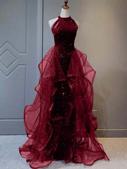 Sparkly Sheath Burgundy Sequin Long Prom Dress Party Dresses S6754