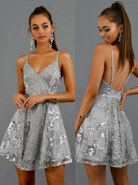 Sparkly Silver Grey Sequin A-line Spaghetti Strap Short Homecoming Dresses S3228