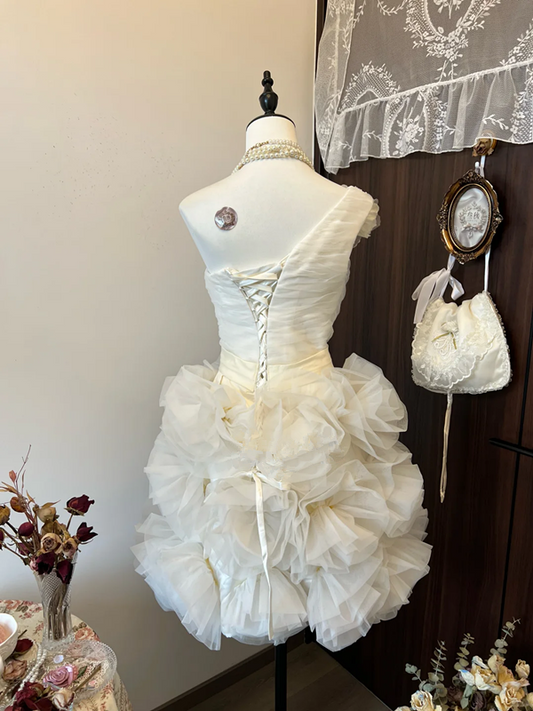 White asymmetrical neckline waist design cake skirt short skirt homecoming dress R4273