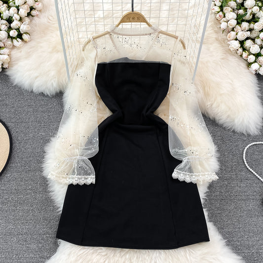 Women Clothes Temperament Robe Patchwork Gauze Black Dress V-neck Lace S555