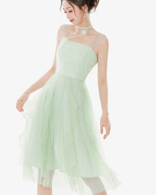 Women's summer suspender dress with ruffled sleeveless niche temperament mid-length skirt R4179