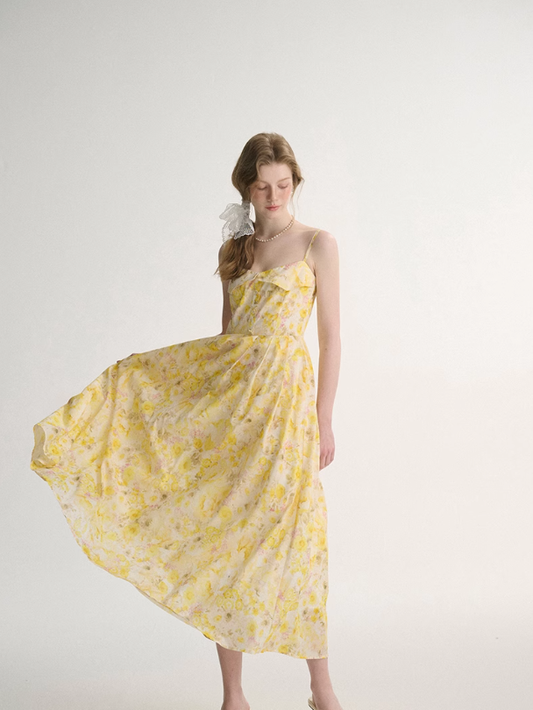 Yellow floral maxi dress suspender dress holiday outfit dress floral dress R2694