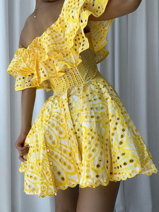 Yellow one-shoulder waist sexy A-line short skirt homecoming dress R3195