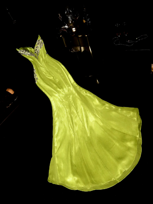 Yellow-green strapless, fitted, bodycon, mermaid-style long ball gown R6986